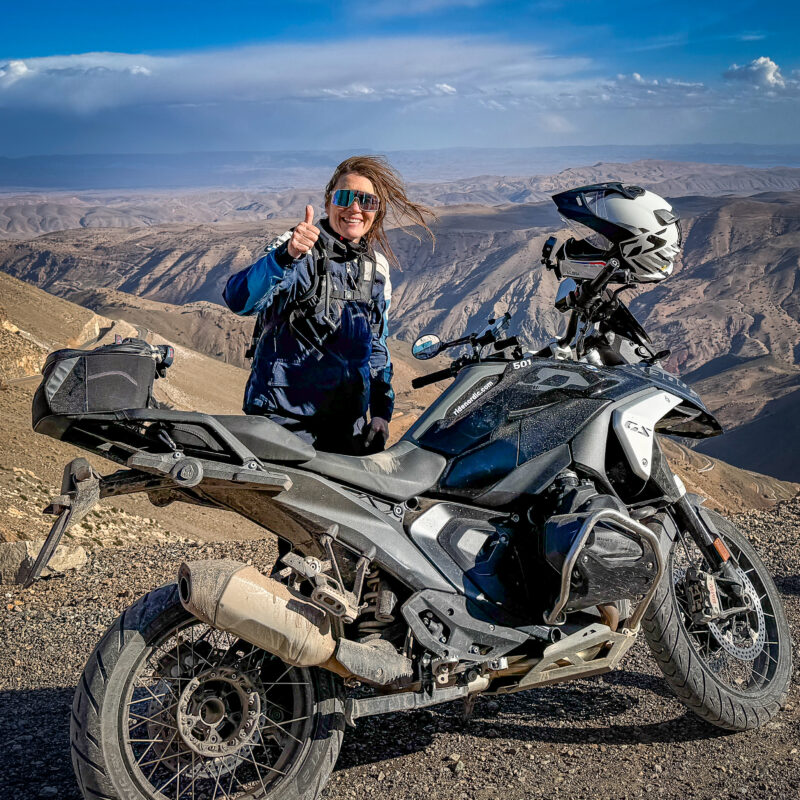 Vi kör BMW R1300 GS med Adaptive Vehicle Height Control, som sänker fjädringen i låg hastighet. BMW R1300 GS är en av de mest lättkörda motorcyklarna på marknaden.